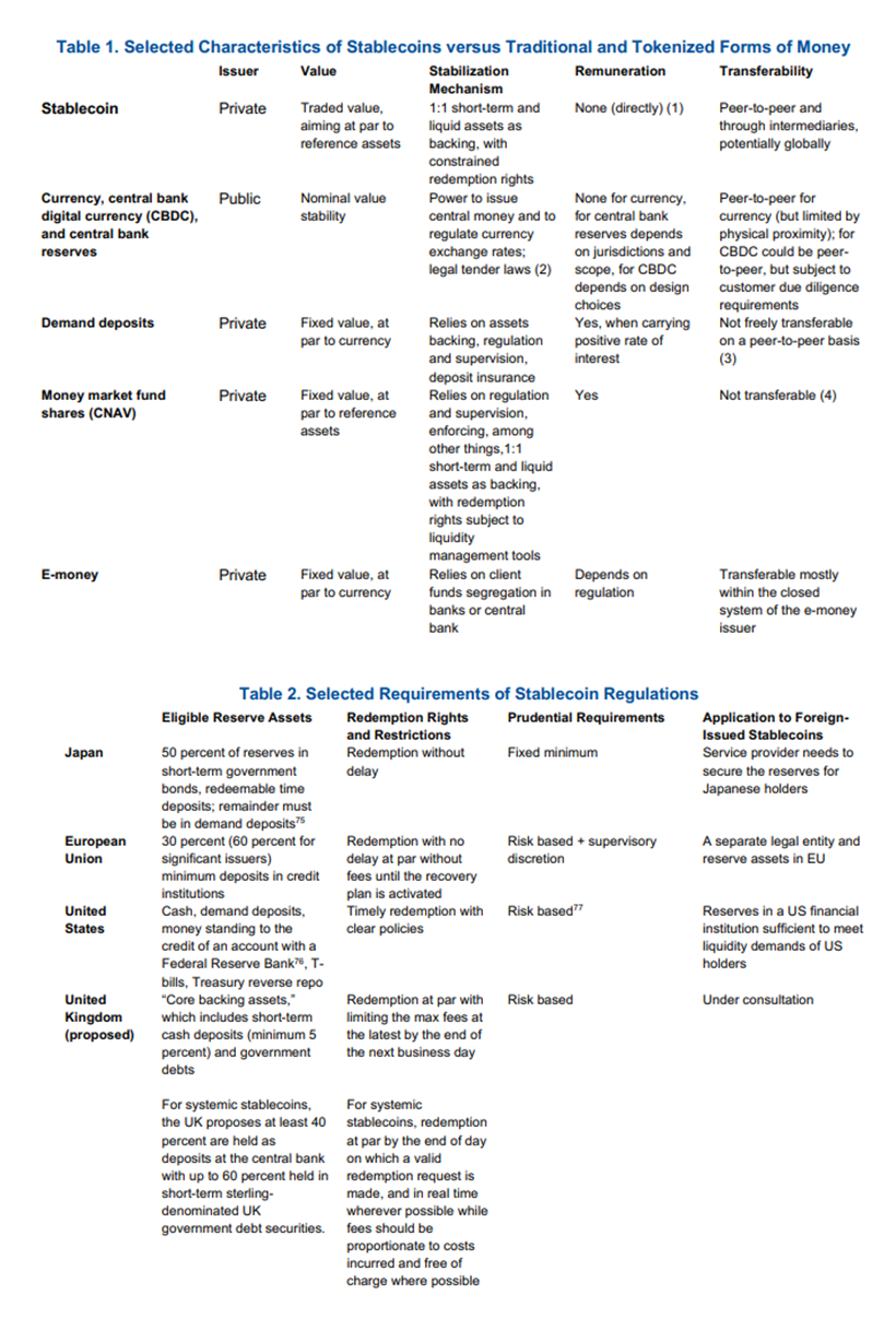 - Stablecoins differ from existing forms of traditional and tokenized assets in several dimensions. Stablecoins are part of the broader trend of asset tokenization-the representation of assets on distributed ledgers, providing a new infrastructure and process through which assets are recorded, issued, and transferred-although stablecoins differ from traditional and tokenized assets in several key ways. Unlike central bank money and deposits (and their potential tokenized form), stablecoins could offer less stability if regulatory frameworks do not address the potential market and liquidity risk of their backing assets and generally provide-at the current juncture-more limited redemption rights. Unlike money market funds (and their tokenized version), stablecoins do not pay returns, at least not directly. Unlike some other tokenized assets, but similarly to unbacked crypto assets, stablecoins generally offer peer-to-peer transferability on public blockchains.
